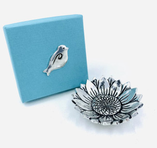 The Sunflower Tiny Pewter Charm Bowl stands out for its detailed craftsmanship and inspiring symbolism. The sunflower motif represents joy, resilience, and optimism, making this piece a thoughtful reminder of brighter days.