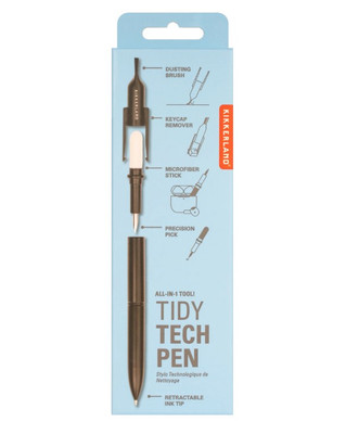 Tidy Tech Pen is a 5-in-1 tool with brush, pick, microfiber, and pen, perfect for cleaning keyboards, screens, and devices easily.