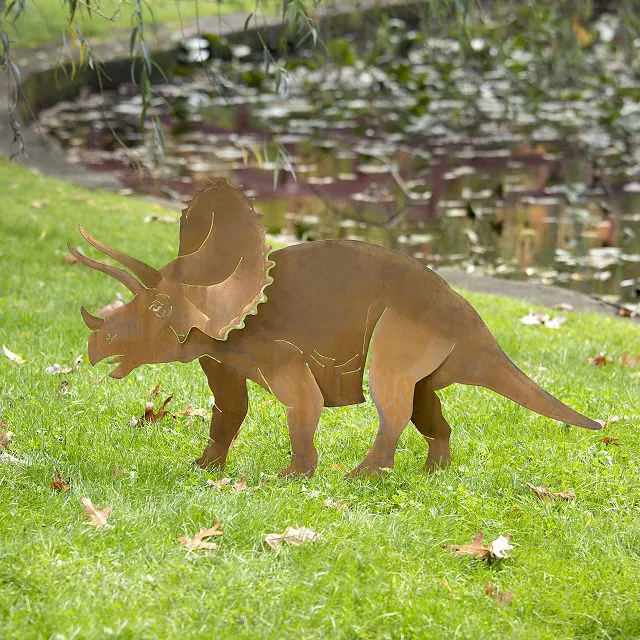 These sculptures are more than just lawn decorations—they are conversation starters. The set includes one adult triceratops and one baby, both secured with stakes to ensure stability in your yard. Built to withstand the elements, each piece gradually develops a rustic finish that enhances its lifelike charm.