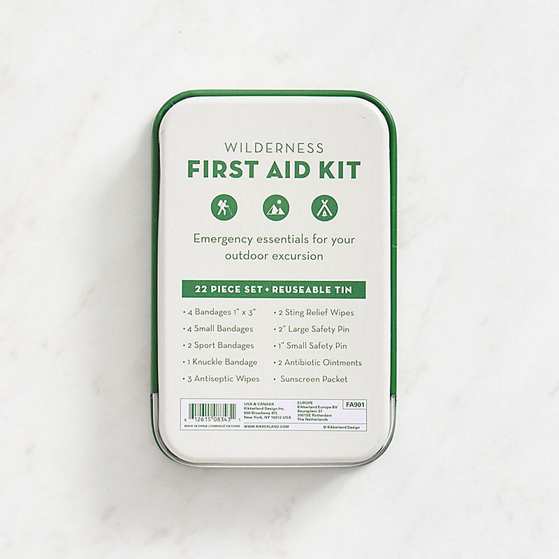 Wilderness First Aid Kit in a Tin includes 22 essentials for treating minor injuries during travel, hiking, and outdoor adventures.