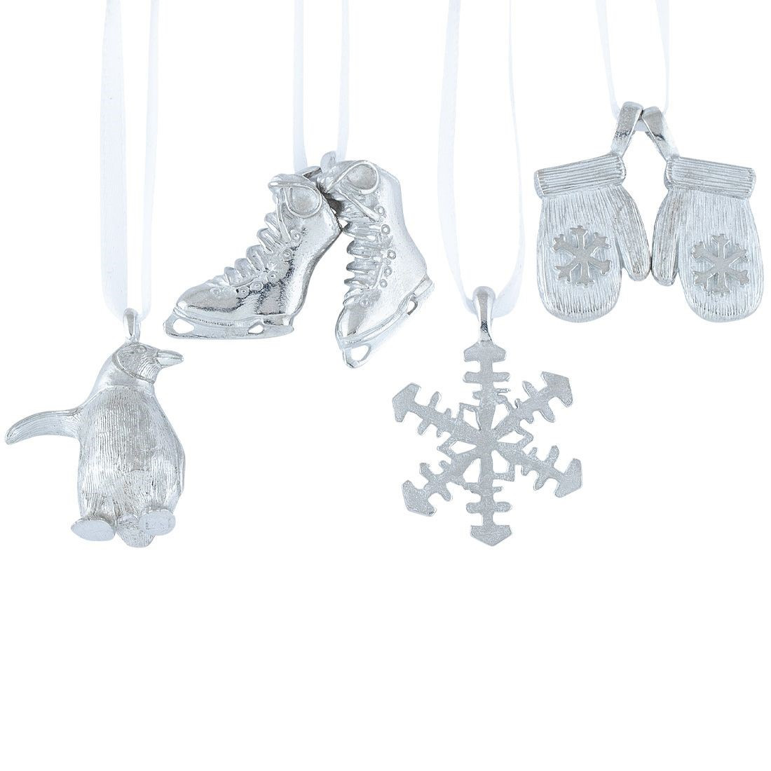 The Winter Fun Mini Pewter Ornament Set, 4 pc features four finely crafted pewter designs, including a penguin, ice skates, a snowflake, and a pair of mittens. Each piece is tied with a white satin ribbon and presented in a decorative silver snowflake keepsake box, making it both a charming decoration and a thoughtful collectible.